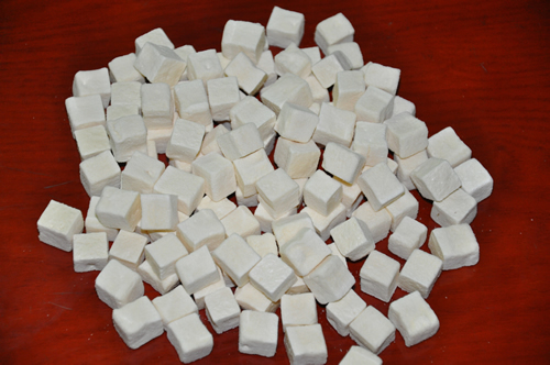 FD bean curd is made from bean curd which is dipped out, defibrination,boiling the bean milk ,cooling,cutted,frozen quickly,dehydrated etc. The product’s moisture is below 4%. It’s color is shallow yellow or white. It has original fresh bean curd taste and texture is tightness. It is complete hydration over 95℃ within 30 seconds. The product is suit for soups and cup-o'-noodles ingredient. |